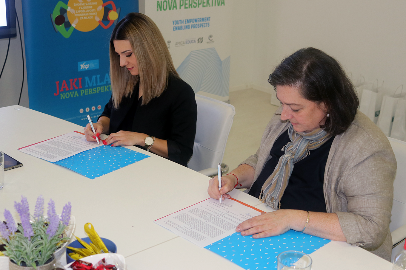 Ceremonija uručenja donacije ozvaničena je potpisivanjem ugovora o donaciji između rukovodioca Službe marketinga kompanije Bingo Tatjane Paunoski i nacionalne direktorice SOS Dječijih sela uBiH Mirele Gruenther-Đečević.
